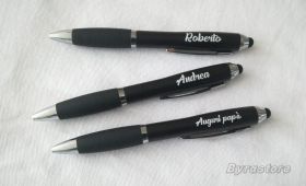 La penna a sfera  è dotata di gommino per touch screen e meccanismo a rotazione grip in gomma minuterie in metallo cromato refill con sfera al tungsteno