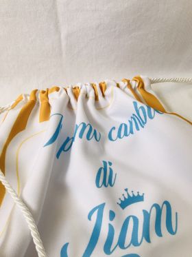 Per essere pronti all'arrivo della cicogna non può mancare il sacco porta corredino personalizzato con il nome del piccolo!