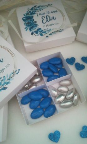 Le bomboniere sono personalizzabili con qualsiasi grafica,complete con confetti vari gusti con bigliettino.