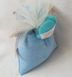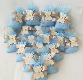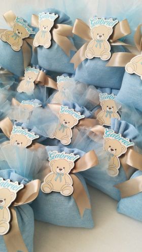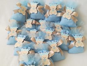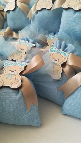 Sacchetto celeste colorato bomboniera nascita con Orsetto in legno personalizzato con nome