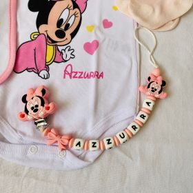 Corredino neonato set completo personalizzato con nome Minnie e catenina con lettere in silicone