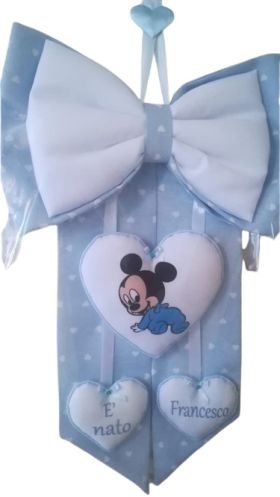 Il fiocco nascita è interamente realizzato con tessuti di puro cotone con morbide imbottiture di ovattina ed i disegni e le frasi sono realizzati a ricamo.
