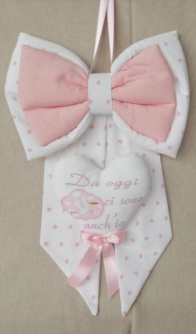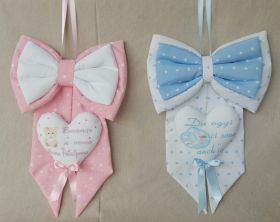Il fiocco nascita è interamente realizzato con tessuti di puro cotone con morbide imbottiture di ovattina ed i disegni e le frasi sono realizzati a ricamo.