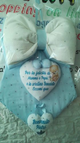 Il fiocco nascita è interamente realizzato con tessuti di puro cotone con morbide imbottiture di ovattina ed i disegni e le frasi sono realizzati a ricamo.