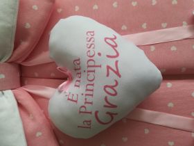 Il fiocco nascita è interamente realizzato con tessuti di puro cotone con morbide imbottiture di ovattina ed i disegni e le frasi sono realizzati a ricamo.