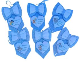 Il fiocco nascita è interamente realizzato con tessuti di puro cotone con morbide imbottiture di ovattina ed i disegni e le frasi sono realizzati a ricamo.
