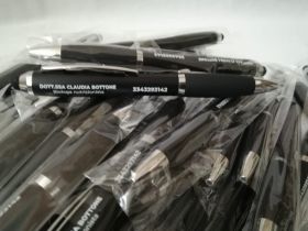 La penna a sfera è dotata di gommino per touch screen e meccanismo a rotazione grip in gomma minuterie in metallo cromato refill con sfera al tungsteno
