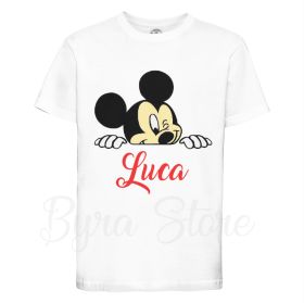 T-shirt per bambino personalizzata con nome Minnie o Topolino che esce dalla tasca