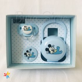 La scatola comprende: un succhietto con tettarella a scelta, una catenella e una borsetta porta succhietto.