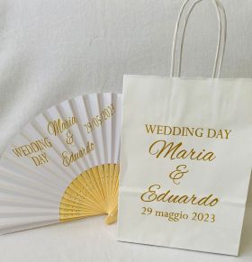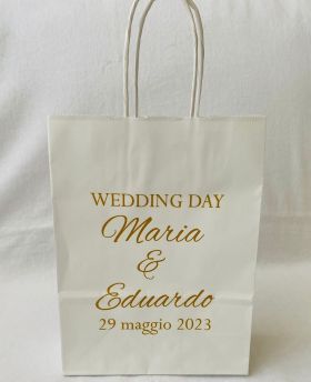- Busta in carta con manico intrecciato bianca misura 24x18x8 cm con stampa logo matrimonio